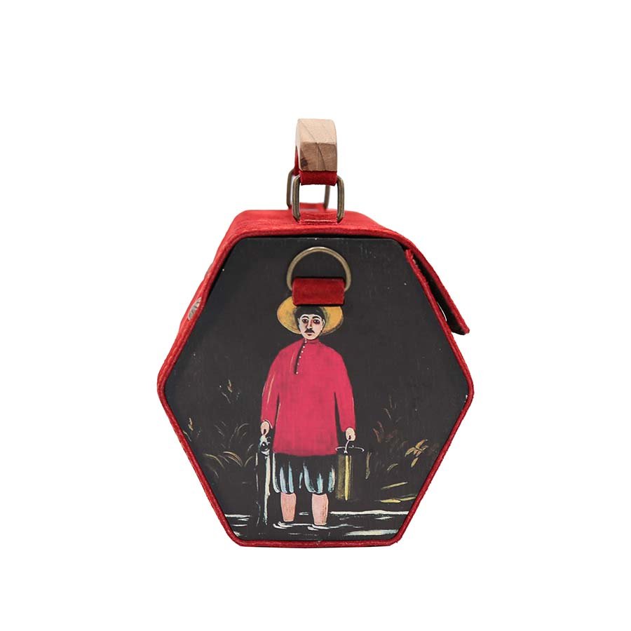 ნატურალური ზამშით და ხის კომბინაციით შექმნილი ჩანთა, რომელზეც დატანილია მებადურის პრინტი