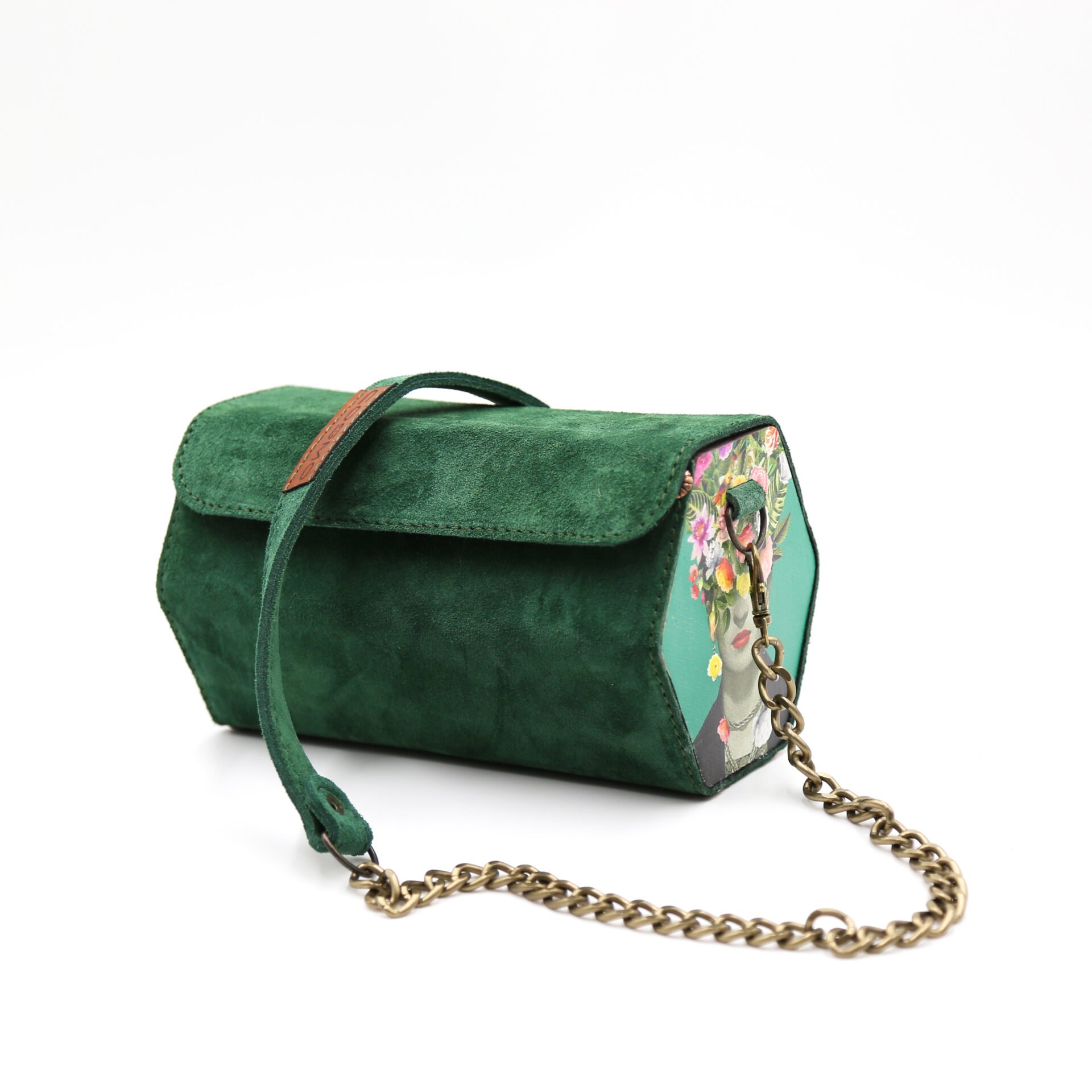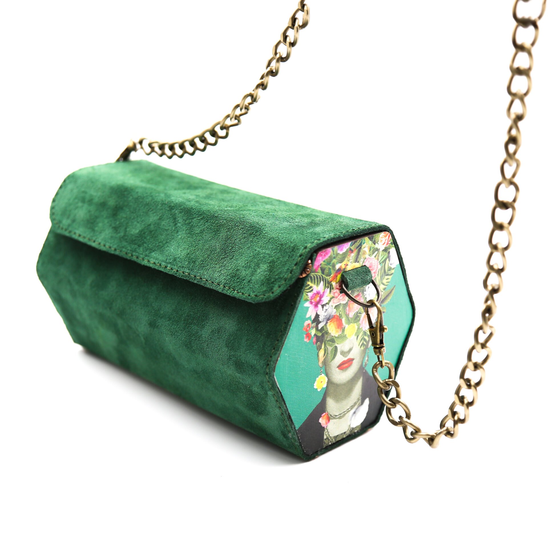 ნატურალური ზამშით და ხის კომბინაციით შექმნილი ჩანთა, რომელზეც დატანილია მებადურის პრინტი