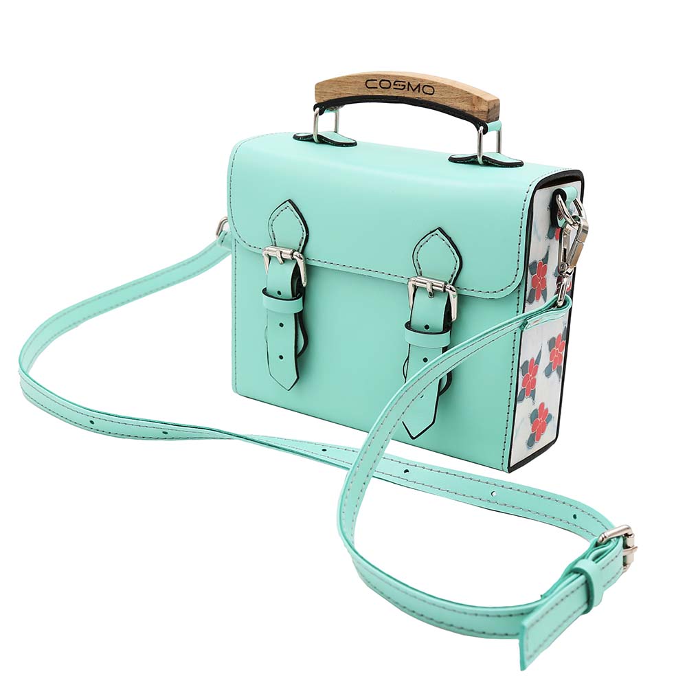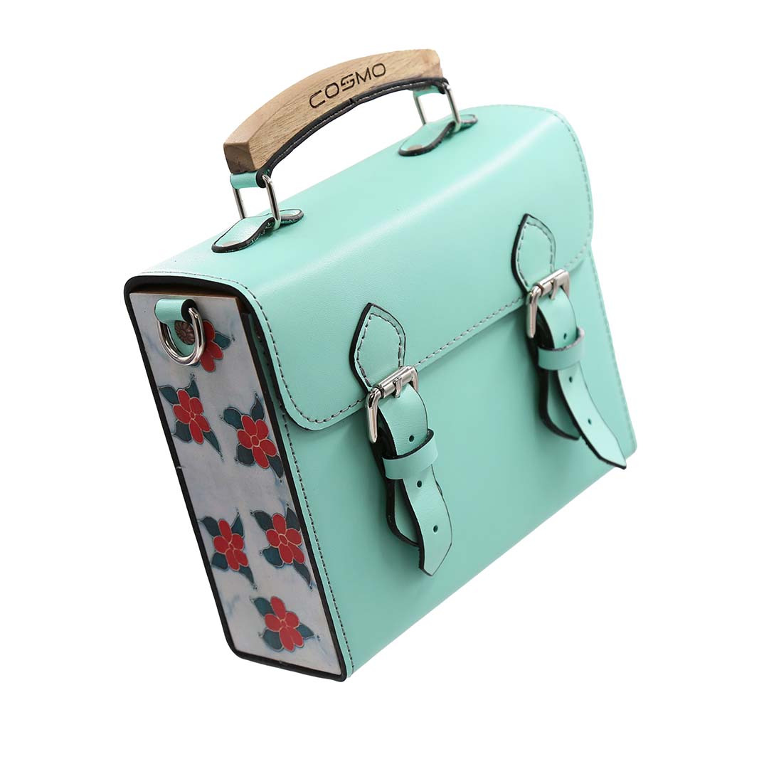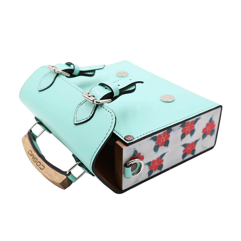 ნატურალური ტყავის და ხის კომბინაციით შექმნილი ჩანთა, რომელიც შთაგონებულია ძველი ქართული ქსოვილის ორნამენტებით